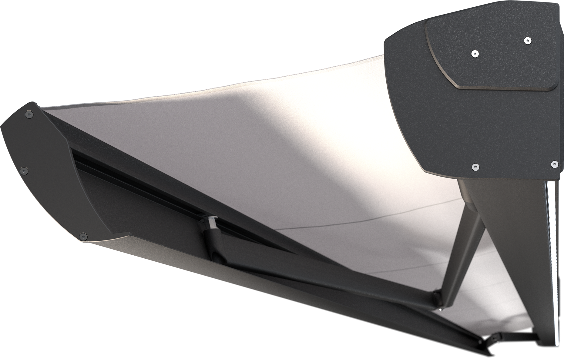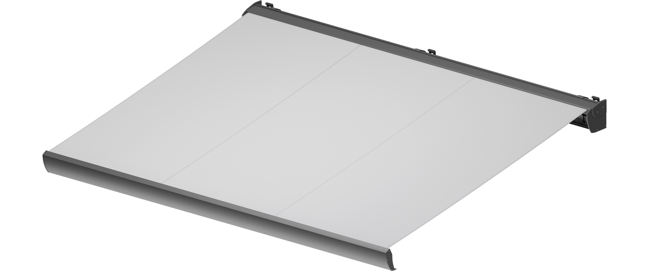 Álló hengertartós napellenző extrudált alkatrészek alkalmazásával. Kisebb szerkezeti előállásával keskenyebb ereszek alá is szerelhető.